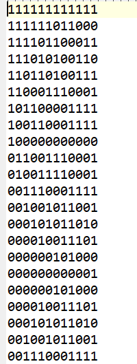 binary_wave = dec2bin(quantized_wave + 2048, N);